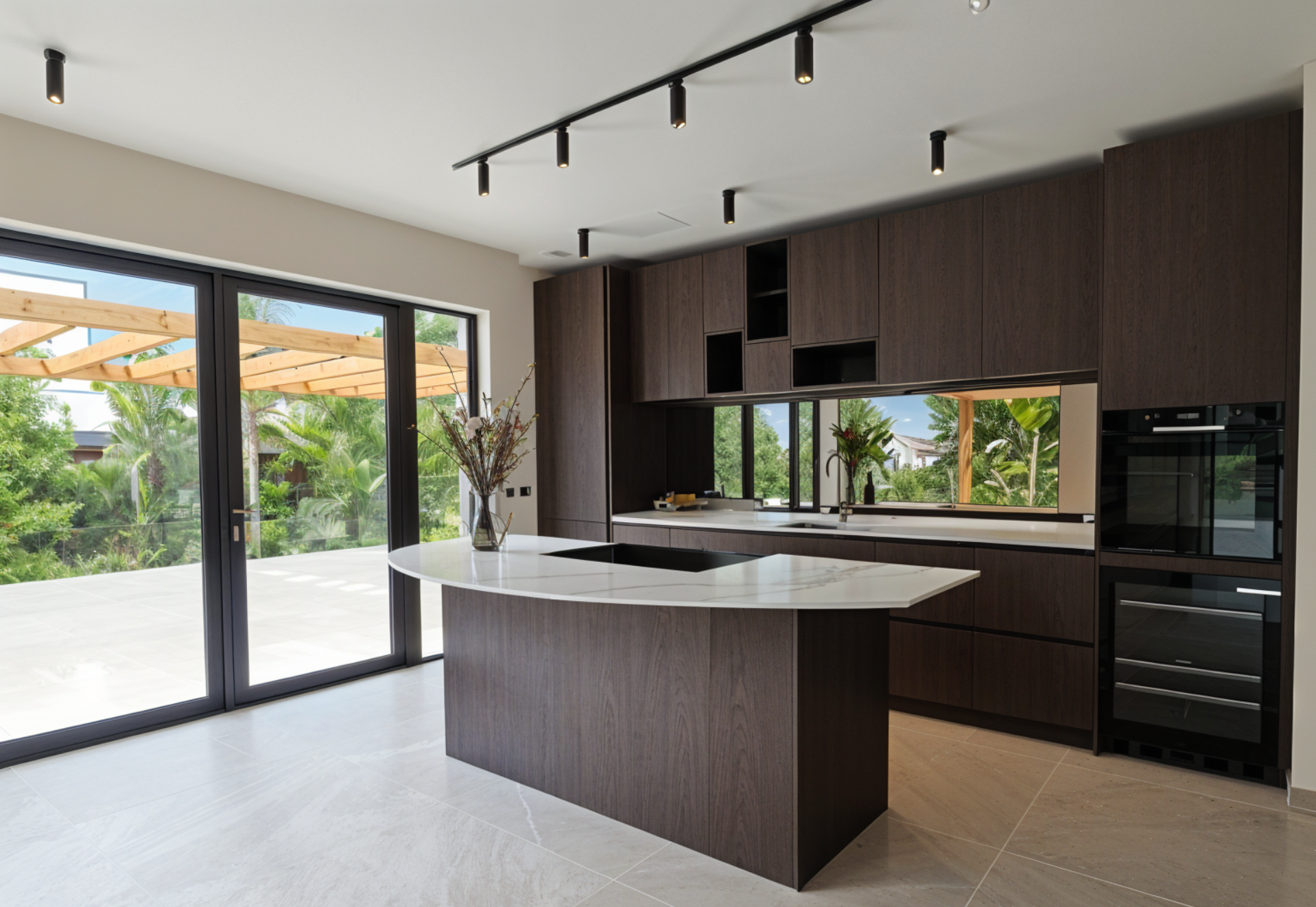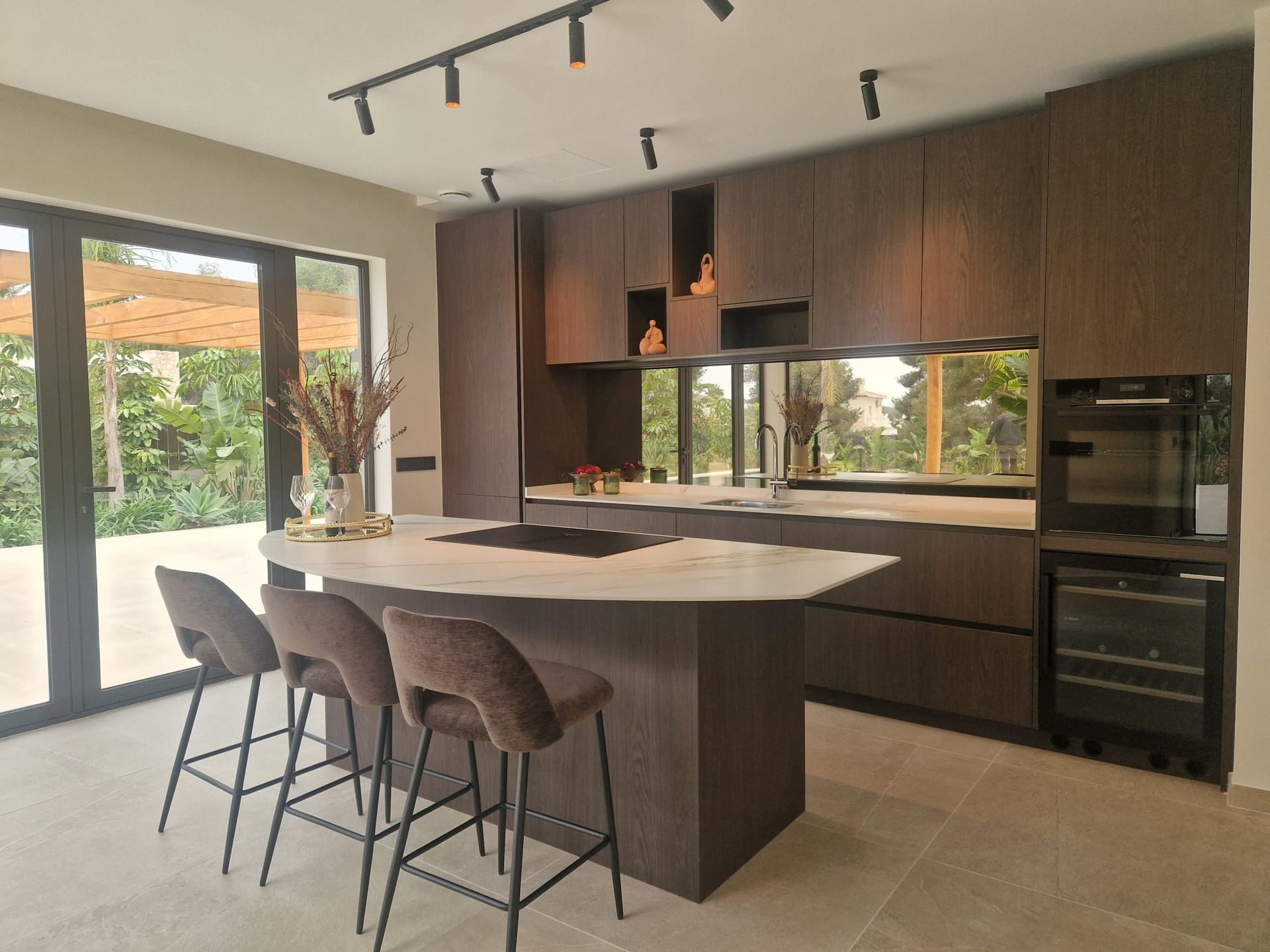 De prachtige keuken met kookeiland en inductiekookplaat met geïntegreerde afzuigkap, koelkast, wijnkoeler en vaatwasser van de beste merken. Een genot voor liefhebbers van koken.